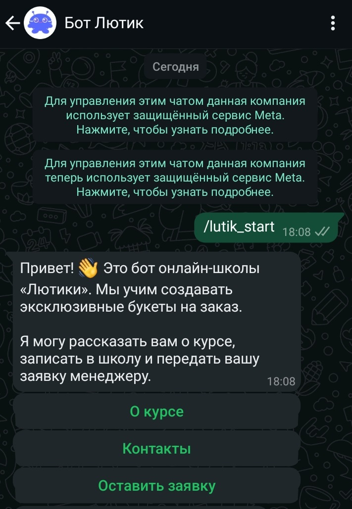 Вот так выглядит бот нашей онлайн-школы «Лютики» в WhatsApp: