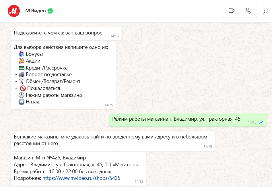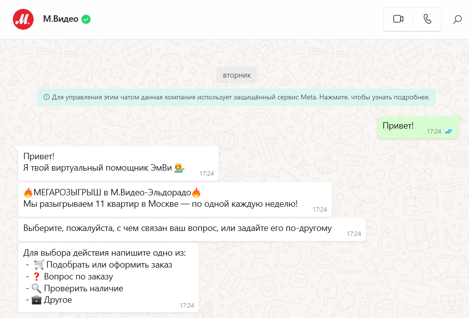 Боты используют компании из разных сфер бизнеса: ритейлеры, интернет-магазины, онлайн-школы, разработчики ПО и другие. Например, М.Видео создали в WhatsApp виртуального помощника ЭмВи. В боте можно узнать об акциях, подобрать товар, проверить его наличие в магазине и оформить заказ.
