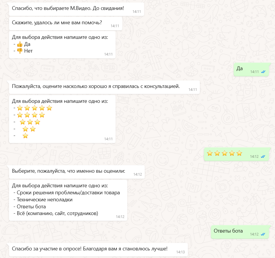После общения с пользователем бот предлагает поделиться впечатлениями. ЭмВи спрашивает, решила ли она вопрос клиента и просит оценить её работу.
