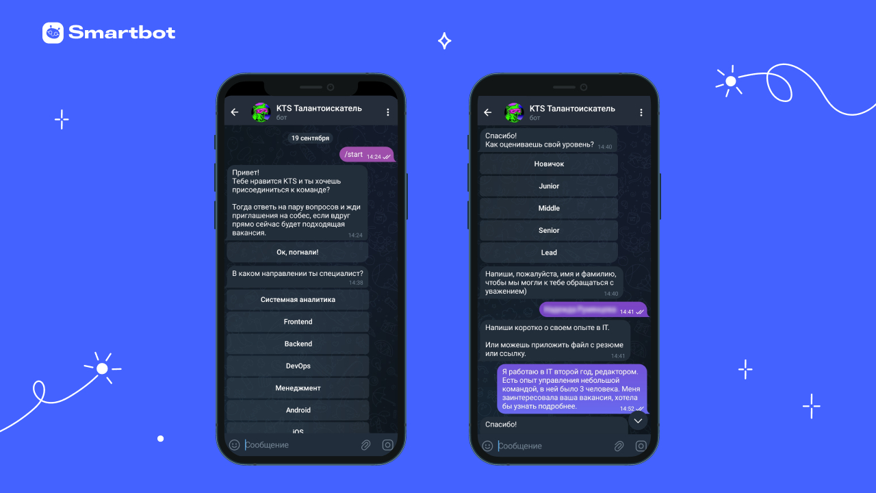 Таким образом, бот автоматически составляет базу соискателей, помогает увеличить скорость ответа и экономит время менеджеров на первичном скрининге. Это позволяет быстрее нанимать сотрудников и тратить на подбор меньше ресурсов.