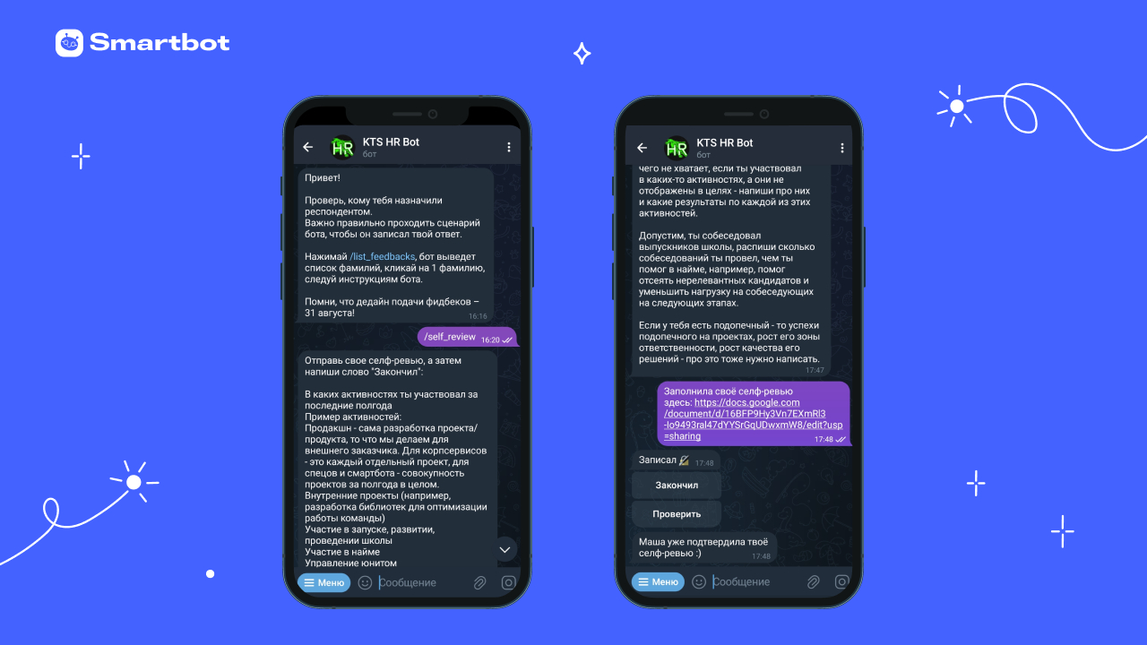 Часть этапов мы автоматизировали с помощью чат-бота. Он отправляет инструкции, собирает анкеты участников и обратную связь от коллег, напоминает о дедлайнах и заносит информацию в базы данных.