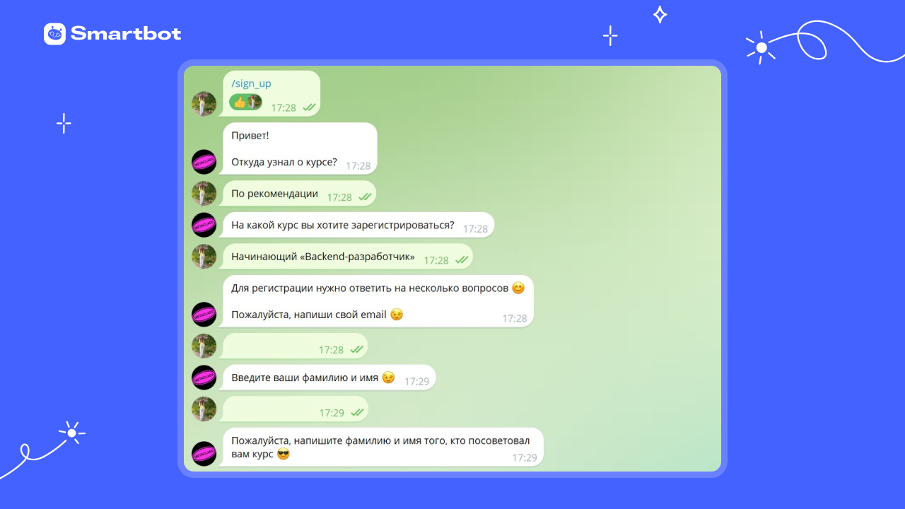 Чтобы администратор школы не занималась этим вручную, Metaclass используют чат-бот в Telegram. Он делит потоки на курсы и автоматизирует регистрацию учеников.