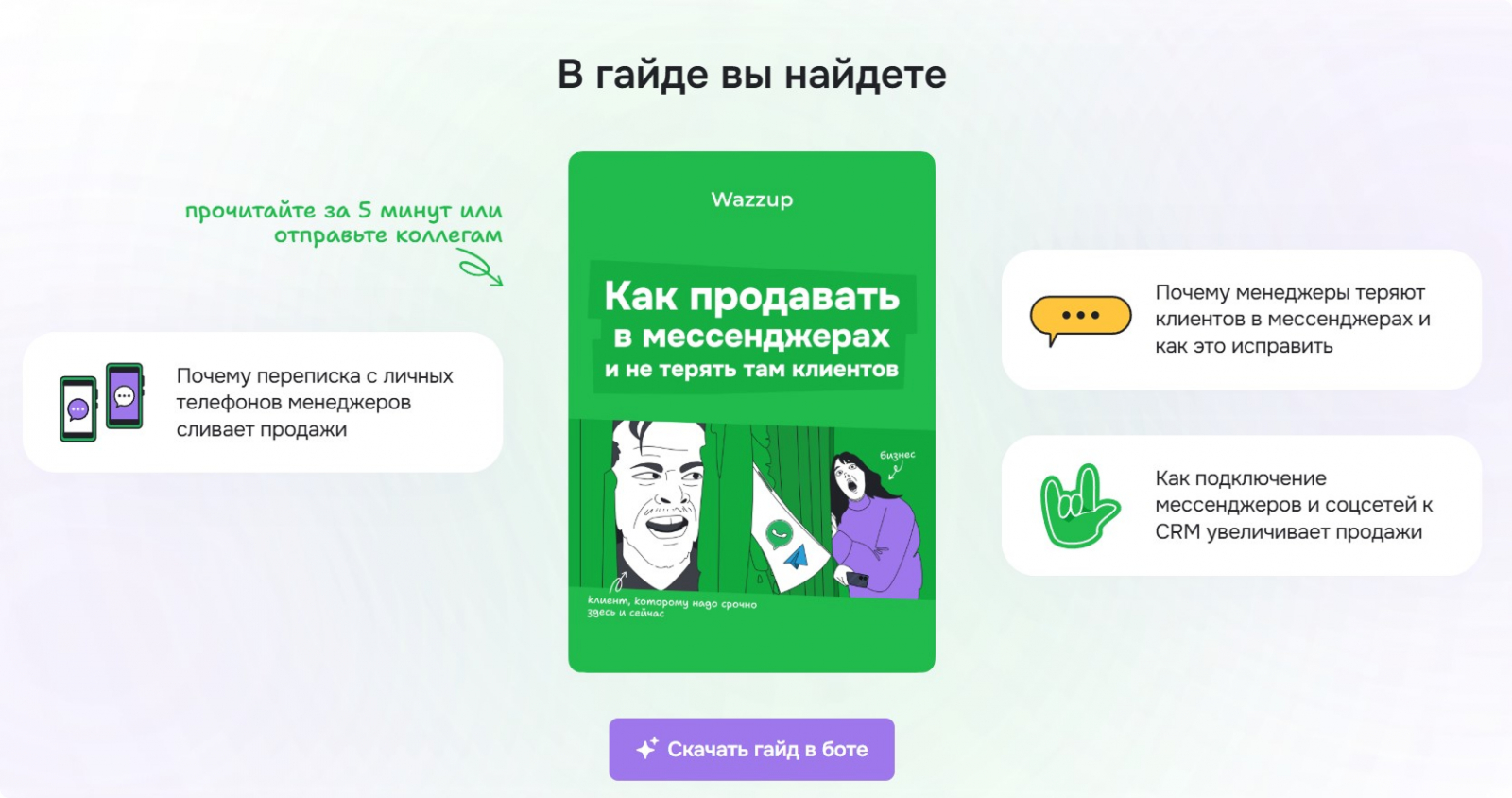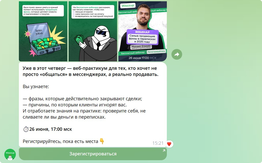 Тех, кто ещё не пробовал Wazzup, бот приглашает протестировать сервис и записаться на обучающие вебинары. Это практические занятия, которые помогают повысить продажи в мессенджерах и знакомят с возможностями продукта.