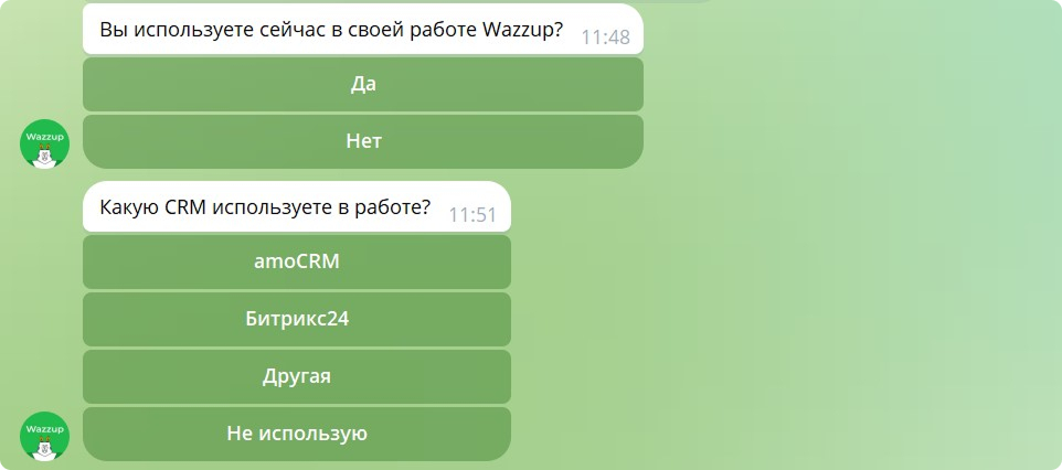 Опрос помогает Wazzup квалифицировать лидов. Так команда маркетинга понимает, насколько целевой трафик приходит с рекламы и как продолжить коммуникацию. Данные пользователей бот сохраняет в специальные переменные в Smartbot Pro.