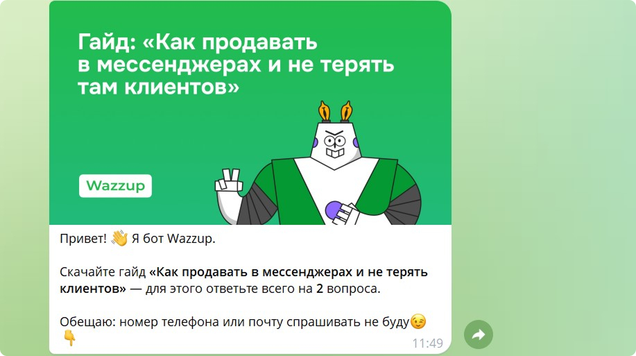 Компания постоянно тестирует разные инструменты для вовлечения аудитории. Поэтому команда маркетинга Wazzup решила проверить гипотезу: возможно ли привлекать и удерживать новых клиентов через полезный контент. Так появилась идея создать чат-бот, который знакомит с продуктом и помогает поддерживать контакт с аудиторией.