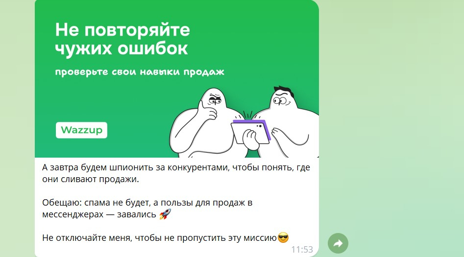 На следующий день участники выполняют ещё одну миссию и в конце получают бонус: чек-лист, который помогает проверять и улучшать переписки в отделе продаж.