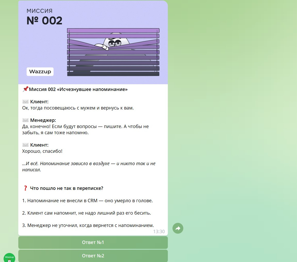 В первый день участнику предлагают пройти две миссии. После ответа на вопрос бот отправляет пояснения к каждому варианту и полезные карточки. Они показывают, как можно решить проблему с помощью функций Wazzup.