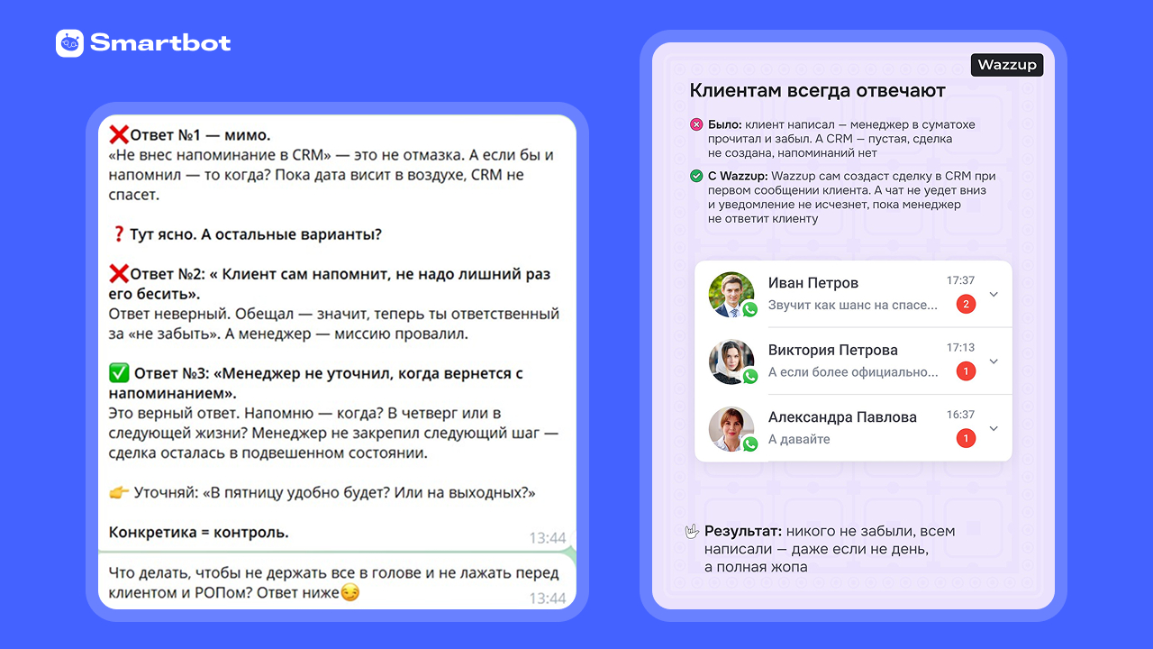 «Wazzup — это привычные WhatsApp и Telegram внутри CRM. Менеджерам не нужно переключаться между каналами, сделка в системе создаётся автоматически, а контакты и история переписки сохраняются в карточке клиента. В результате бизнес сокращает рутину и не теряет заявки из мессенджеров».
