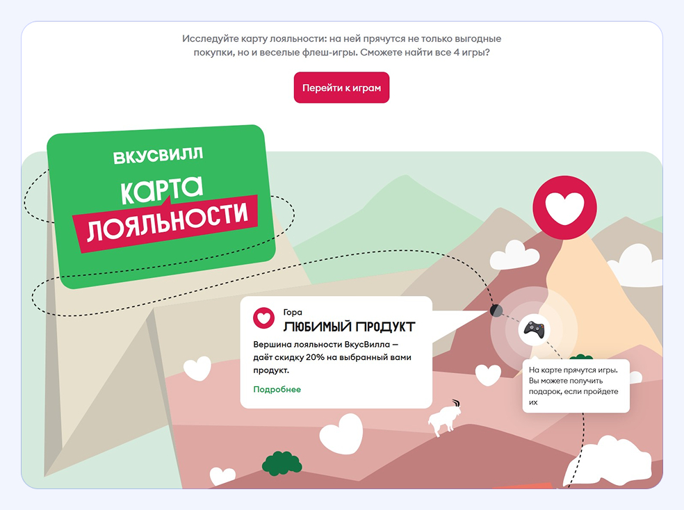 ВкусВилл: геймификация в программе лояльности. Компания разместила на сайте интерактивную карту, на которой спрятаны игры.