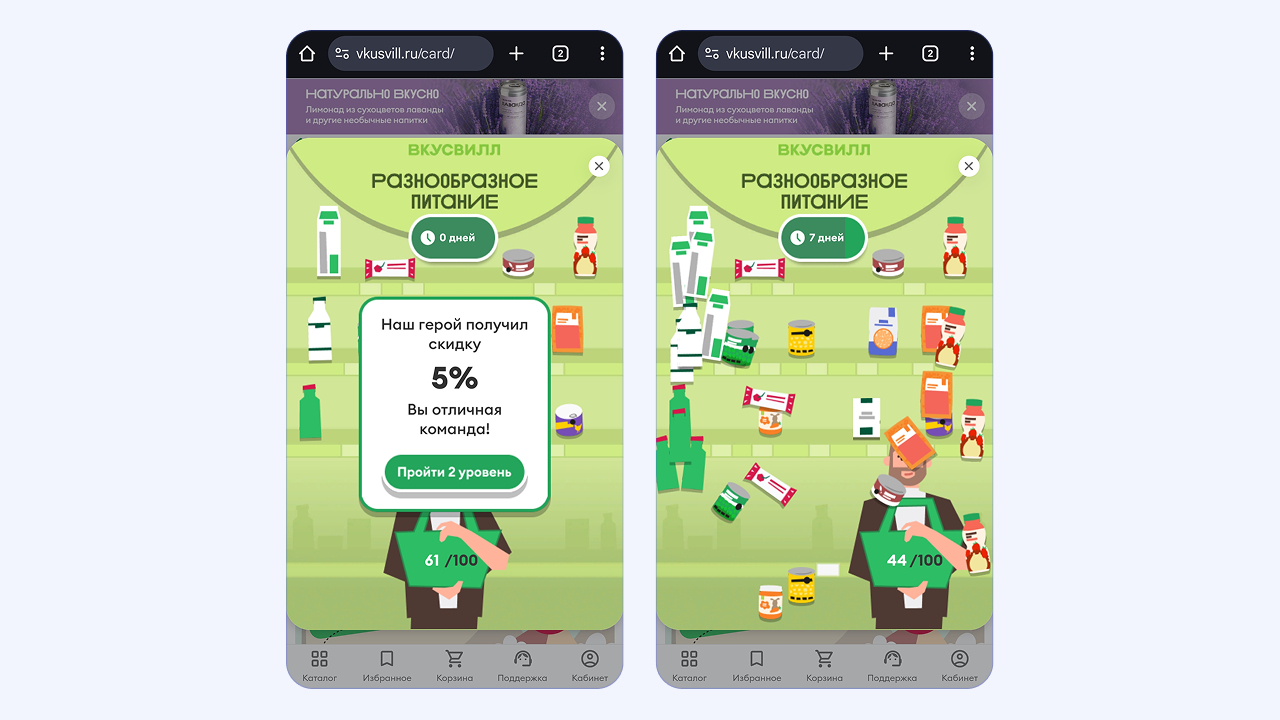 Выполнение задачи вызывает чувство удовлетворения, которое хочется испытать снова. С помощью такой игровой механики бизнес знакомит клиентов с ассортиментом и увеличивает средний чек.