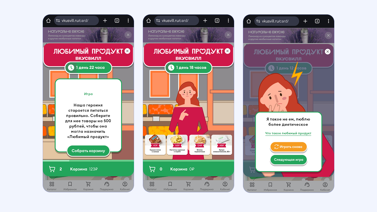 ВкусВилл использует простые игровые механики, которые вызывают азарт и желание проверить себя. Например, в одной игре нужно перемещать героя, чтобы он собирал продукты в корзину. Это всем знакомая механика из «Ну, погоди!», где волк ловил яйца.