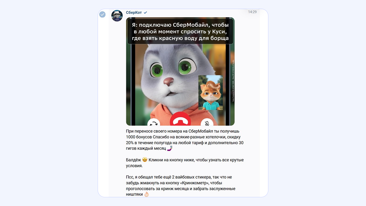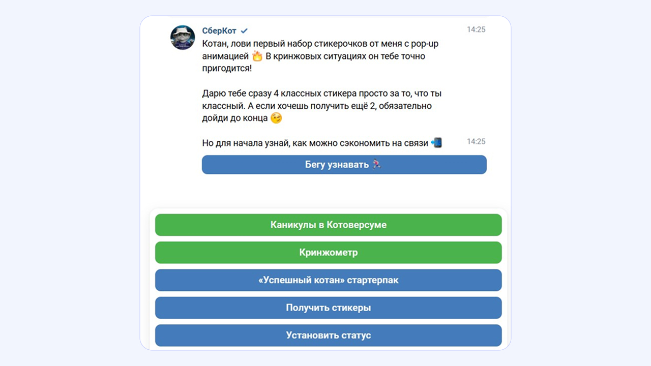 Сбер: игра в чат-боте. У маскота банка СберКота есть отдельное сообщество ВКонтакте. В нём работает чат-бот с несколькими игровыми механиками. Например, можно выполнять задания из рассылок и получать стикеры со СберКотом.