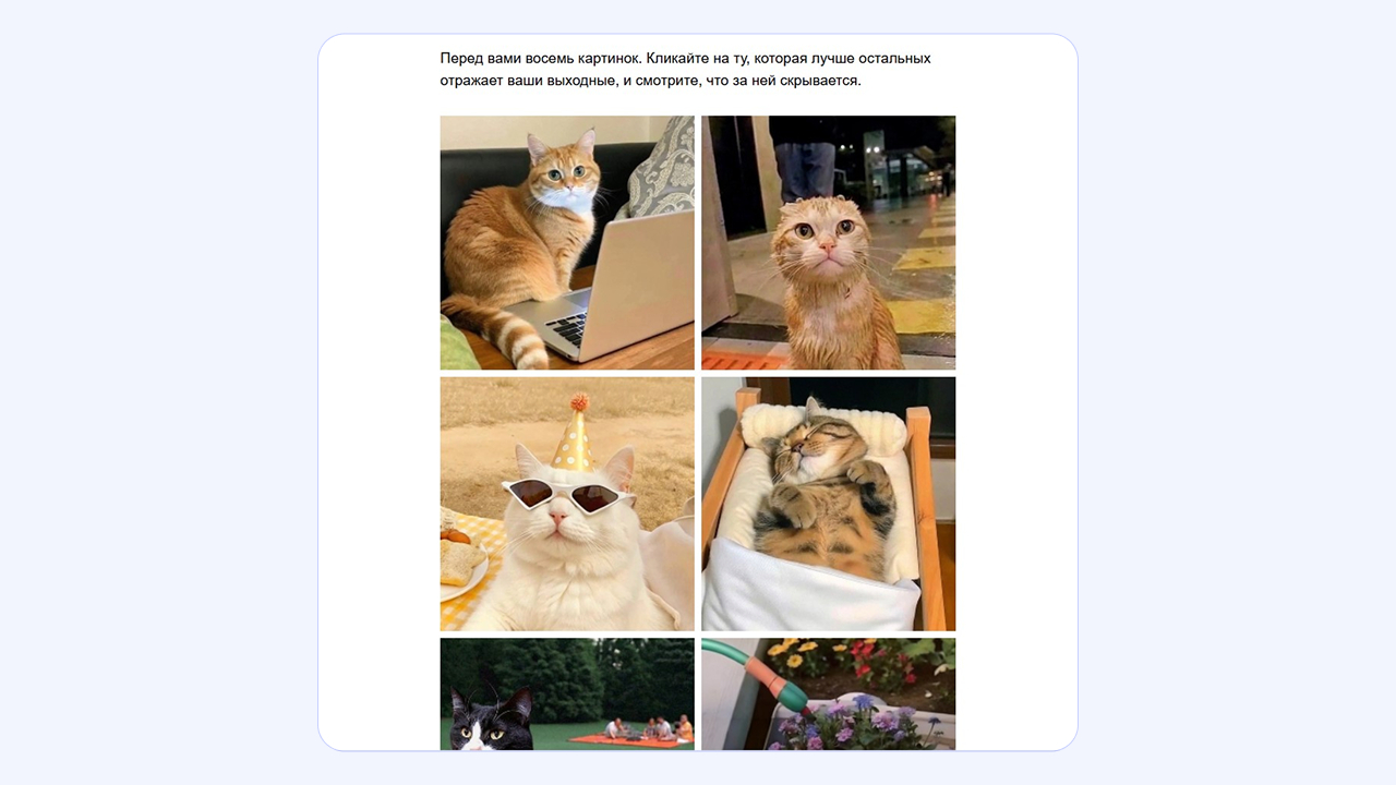 Бизнес-секреты Т-банка: геймификация в email-рассылке. В письме предлагают пройти тест: выбрать кота, который лучше всего выражает, как прошли майские праздники.