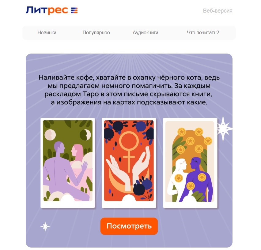 Литрес: гадания на Таро. В email-рассылке компания использует простую игровую механику: предлагает выбрать карту и узнать, какая подборка книг за ней скрывается.
