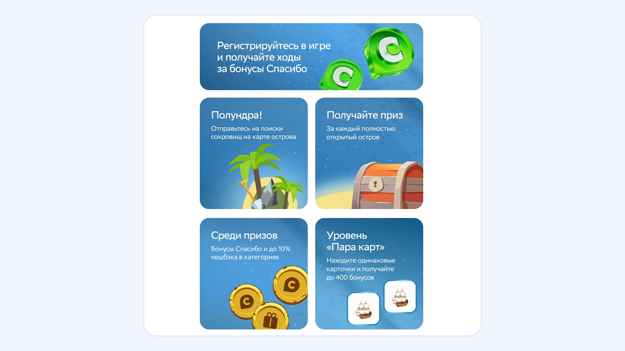 Разберём пример мотивации от Сбера. Банк использует геймификацию в программе лояльности. В email-рассылке клиентам предлагает принять участие в игре «Морские сокровища» на основе популярной механики «Морской бой».