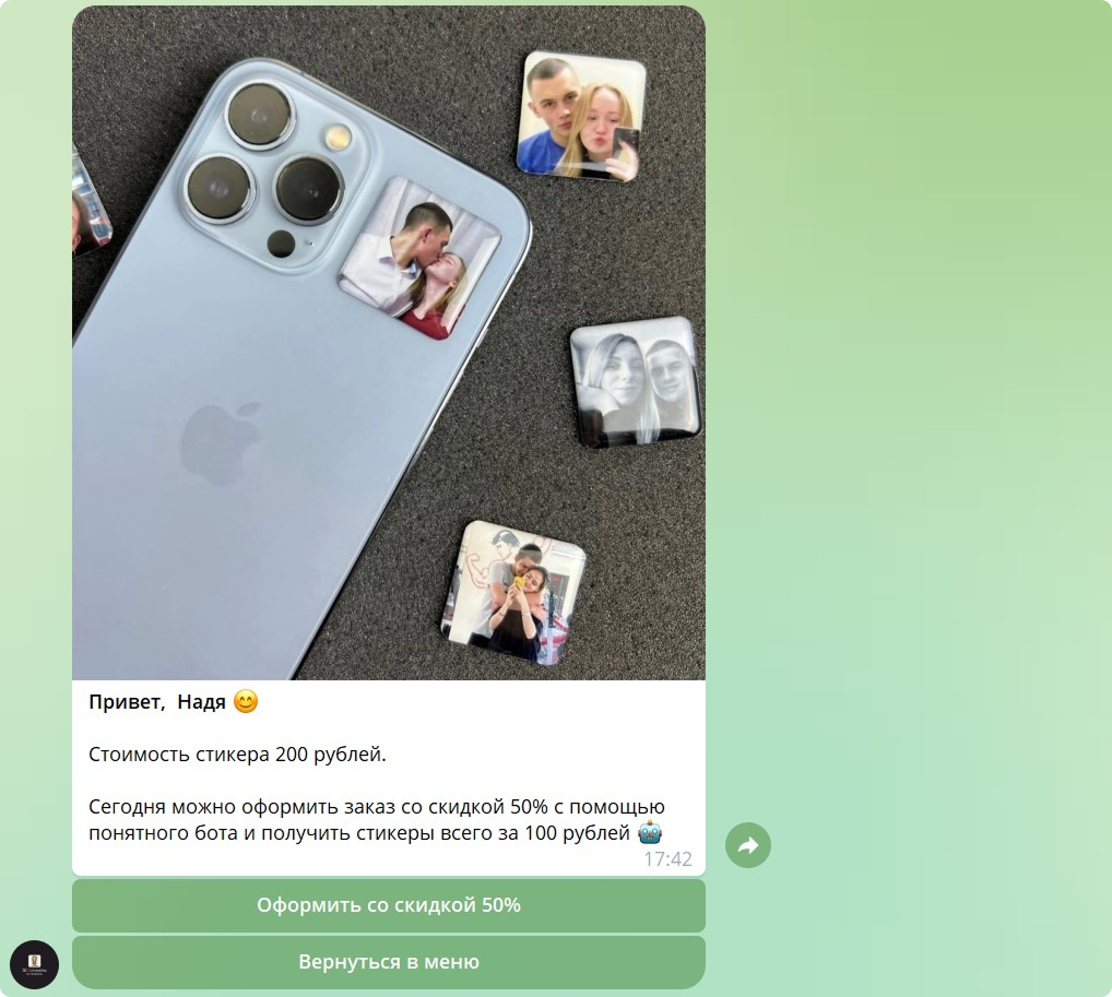 Чтобы не потерять контакт с клиентом и увеличить продажи, отправляйте точечные рассылки в мессенджерах с персональными предложениями. Собирайте данные о покупателях, учитывайте историю заказов и предпочтения. Например, подарите скидку на товары в корзине или избранном.