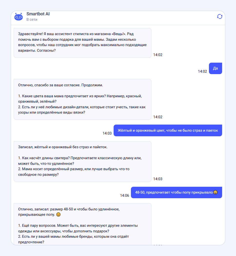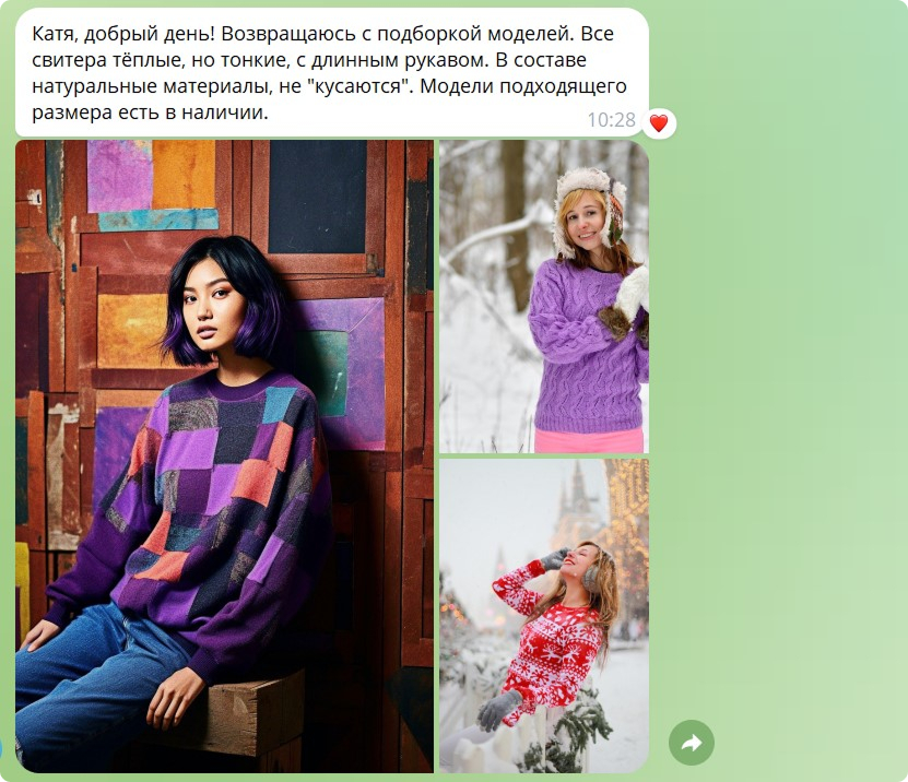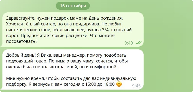 Разберём такой пример продаж в переписке: девушка выбирает свитер в подарок маме. Её пожелания: натуральные ткани, длинный рукав, яркие цвета. Менеджер может задать следующие вопросы, чтобы подобрать подходящие модели: