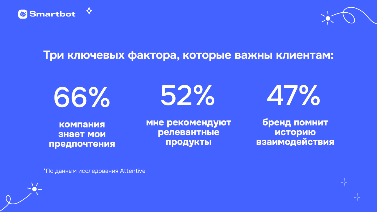 Пользователи ожидают от брендов ненавязчивого общения и релевантных предложений: по данным Attentive, 8 из 10 человек игнорируют сообщения, которые им не интересны, и прекращают взаимодействие с компанией. При этом 77% клиентов оформят покупку, если получат индивидуальные рекомендации.