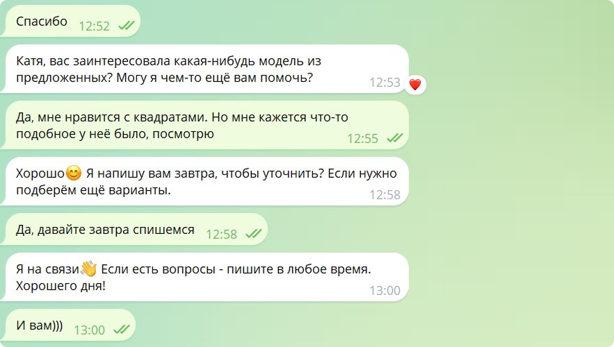 Предложите решение. Когда у вас будет достаточно информации, сформируйте для клиента индивидуальную подборку товаров. Пришлите фотографии и описание 2-4 вариантов, чтобы не перегрузить покупателя и упростить выбор. Если клиенту не понравится, отправьте следующую подборку.