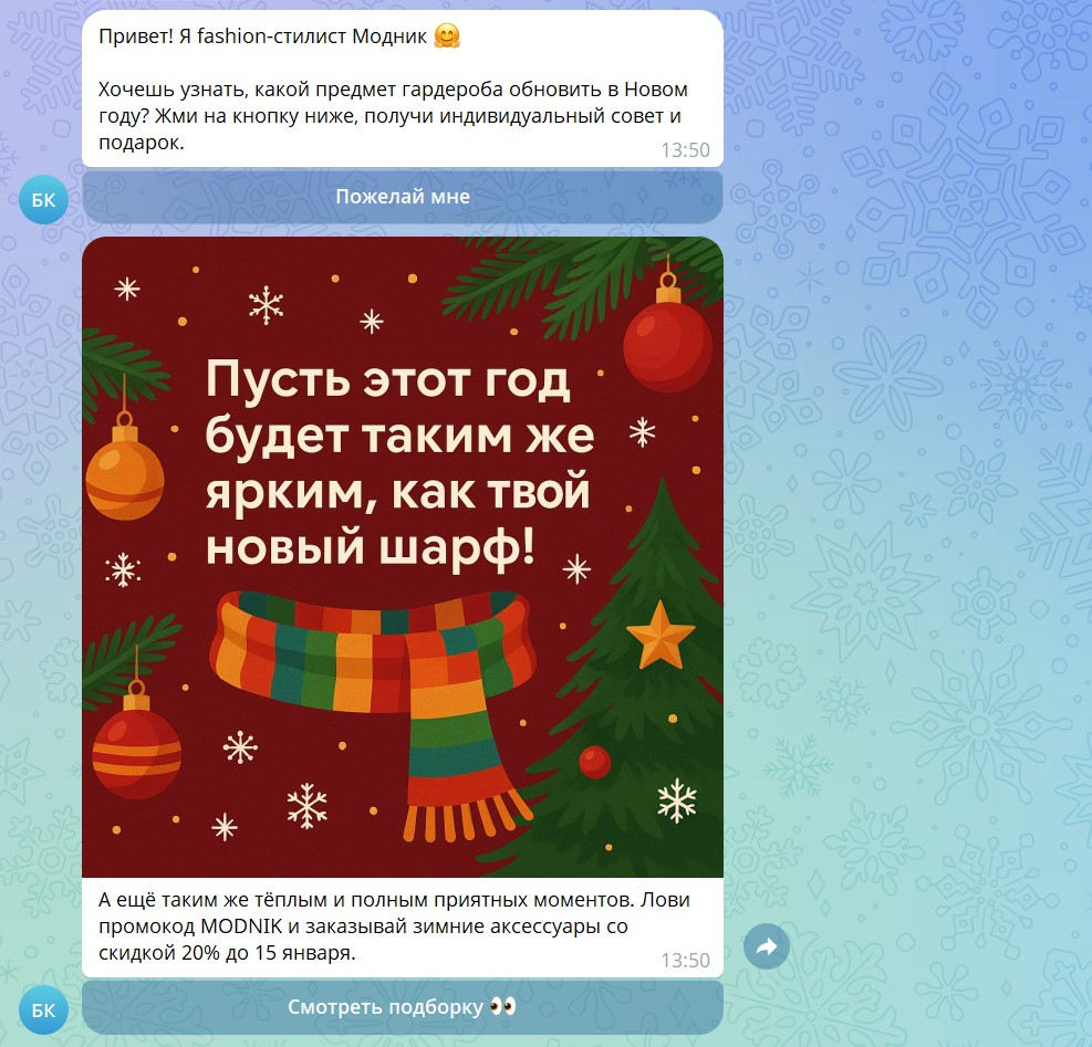 Например, fashion-компании могут создать бота-стилиста, который отправляет тематические пожелания и советует, какую вещь в гардеробе обновить. Чтобы мотивировать на покупку, предложите посмотреть подборку товаров, добавьте промокод или бонусы по программе лояльности.