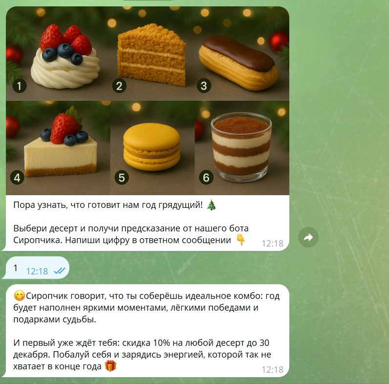В финале игры чат-бот присылает ссылки на выбранные товары и предлагает заказать их или связаться с менеджером. Такая игровая механика знакомит аудиторию с ассортиментом и помогает понять предпочтения. Эти данные можно использовать в дальнейшем для персонализированных предложений.