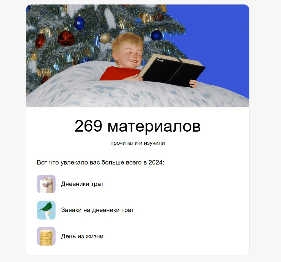 Бренды часто предлагают клиентам узнать свою статистику. Например, Сбер присылает финансовые итоги, Яндекс Go делится результатами поездок, а Т—Ж рассказывает об активности читателя в течение года.