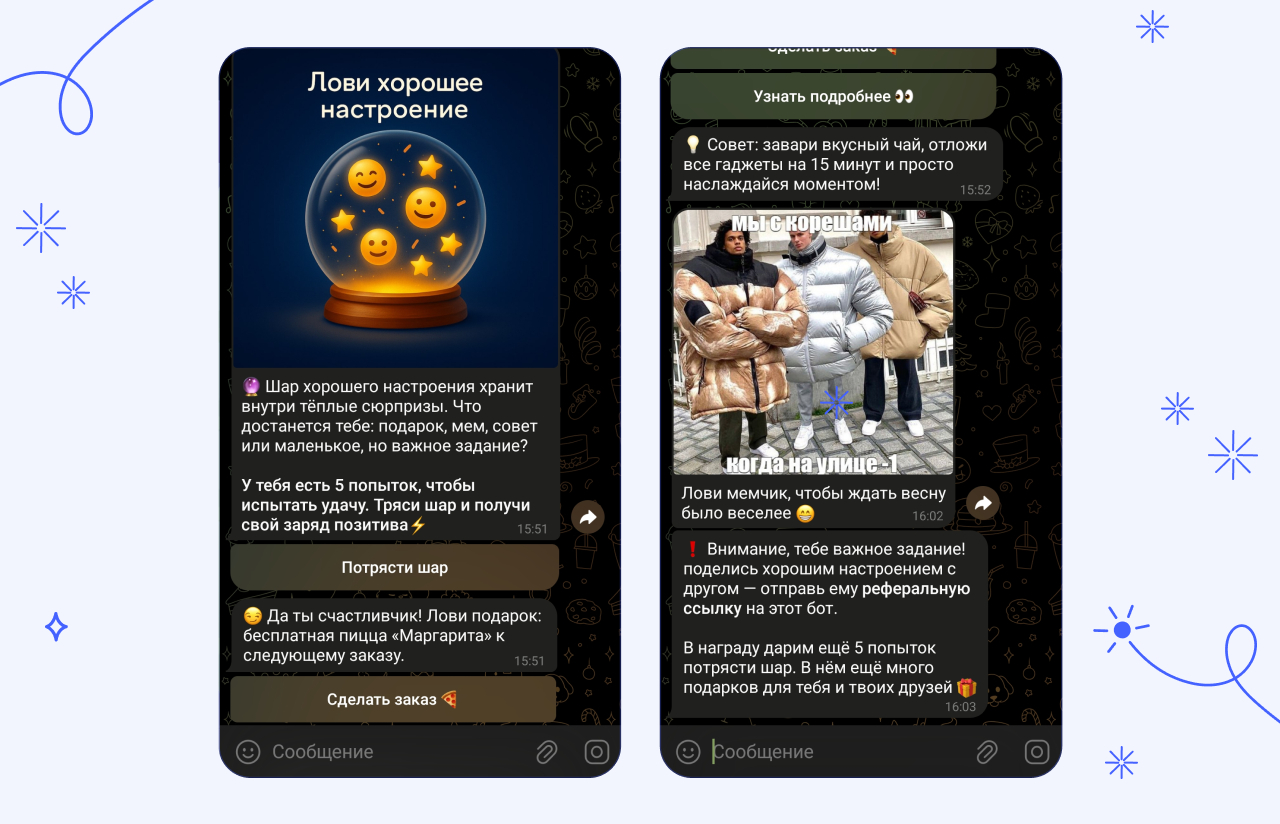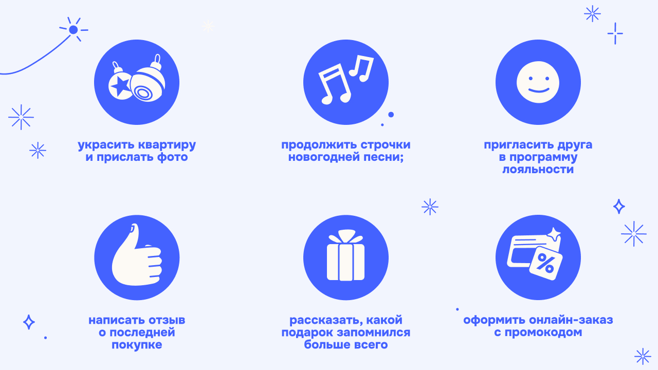 Часть игры можно провести в соцсетях. Например, бот напишет первые строчки новогодней песни в комментариях, а пользователь продолжит её. Такая игровая механика поможет привлечь внимание к акции и увеличить охват аудитории.
