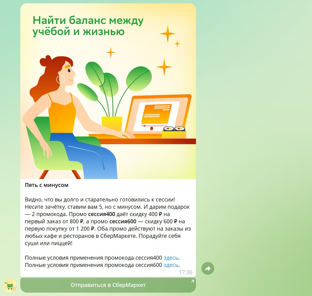 Даже если ваша аудитория давно закончила учёбу, можно использовать этот праздник для запуска тематических игровых механик. Например, СберМаркет проводил игру «Какой вы студент». Бот описывал ситуацию, в которую попал ученик, а участники должны были выбрать, как поступить.
