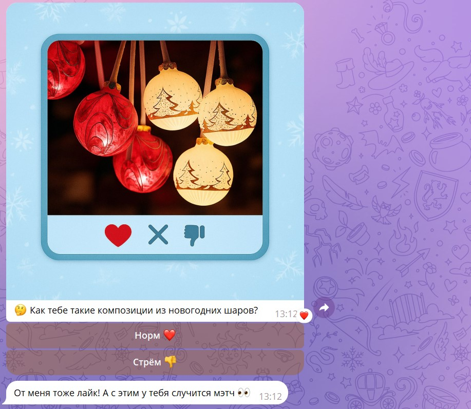 Бот отправляет пользователю 10 фотографий товаров и предлагает выбрать, какие ему нравятся. Можно использовать привычный для тиндера свайп или реакции.