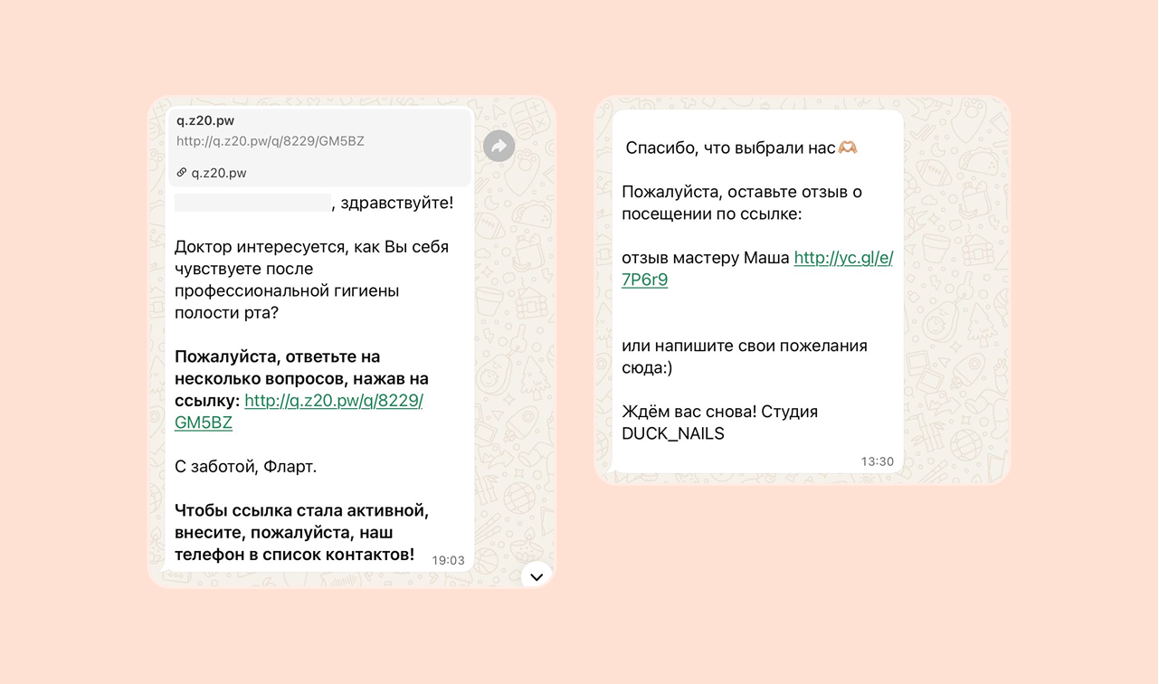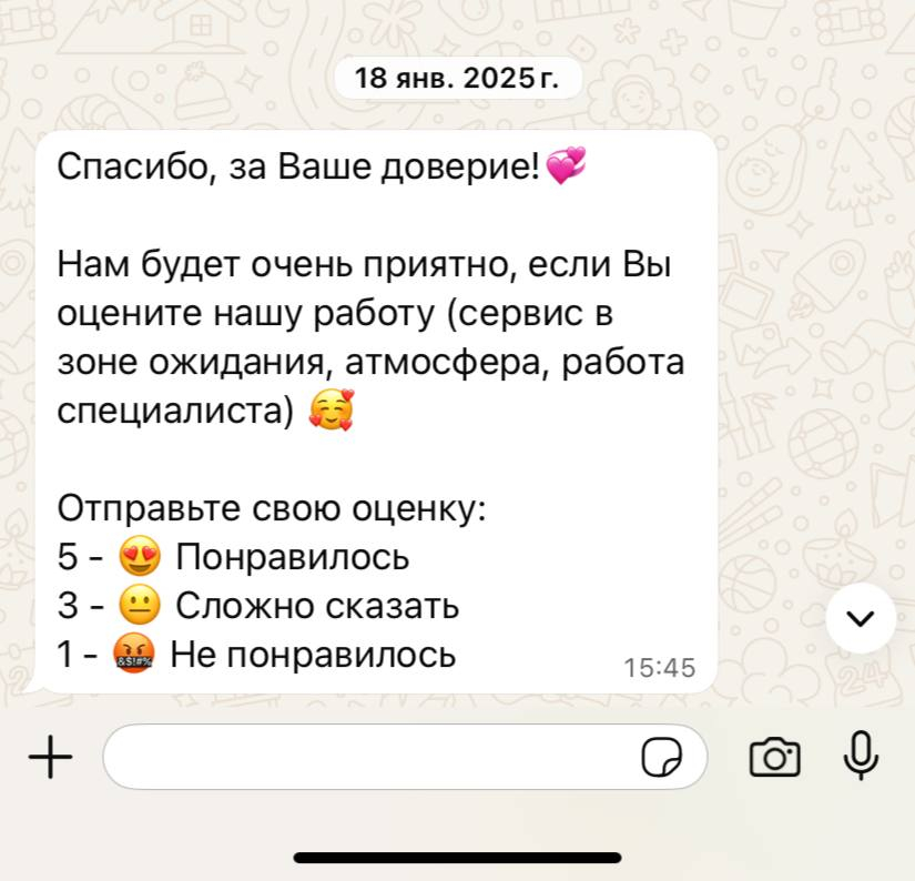 Чтобы экономить время сотрудников и получать больше откликов, настройте триггерные рассылки или подключите чат-бота. Он напишет клиенту в указанное время, проведёт опрос и попросит оставить отзыв на нужном вам ресурсе. Например, на Яндекс.Картах, 2GIS или в соцсетях.