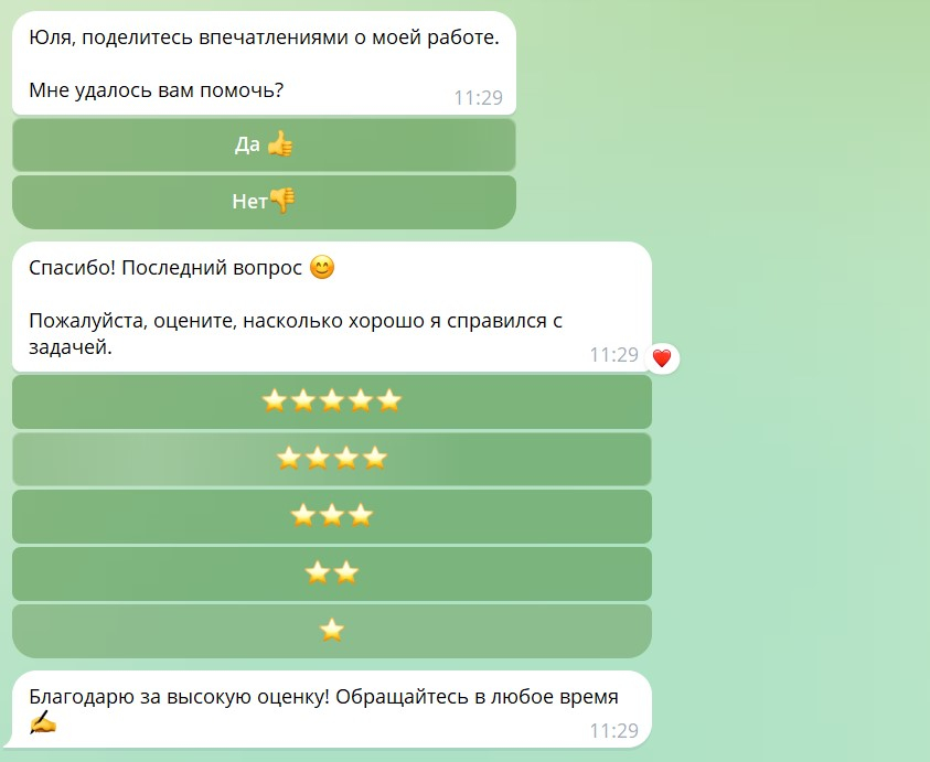 Чат-бот для работы с отзывами сокращает клиентский путь — взаимодействие проходит в привычном интерфейсе мессенджеров, не нужно переходить в приложение или на сайт. Поставить оценку или выбрать вариант ответа можно в один клик.