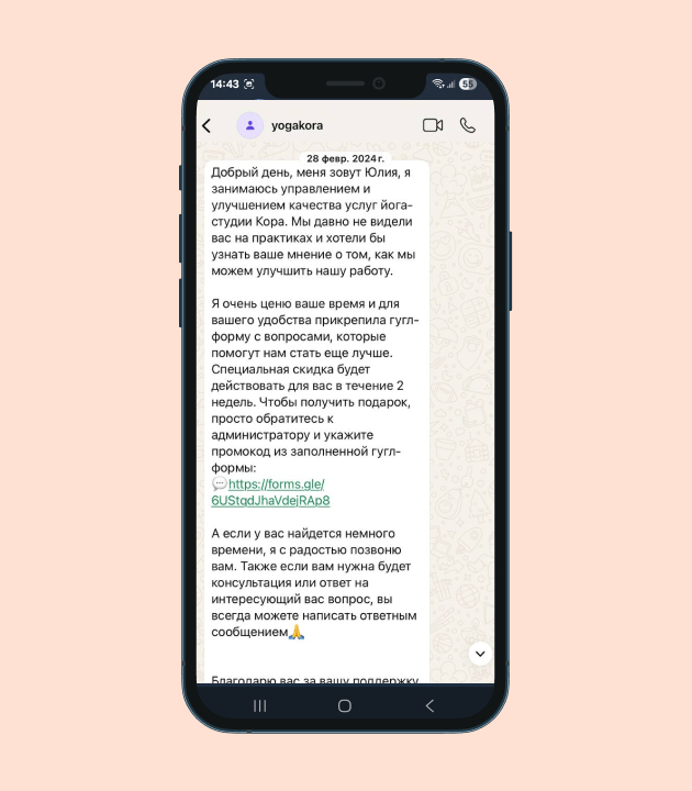 Если нужен развёрнутый ответ, сделайте удобную форму на сайте с минимальным количеством полей или проведите опрос в чат-боте. Чем меньше времени и усилий тратит клиент, тем выше шанс, что он оставит отзыв о компании.