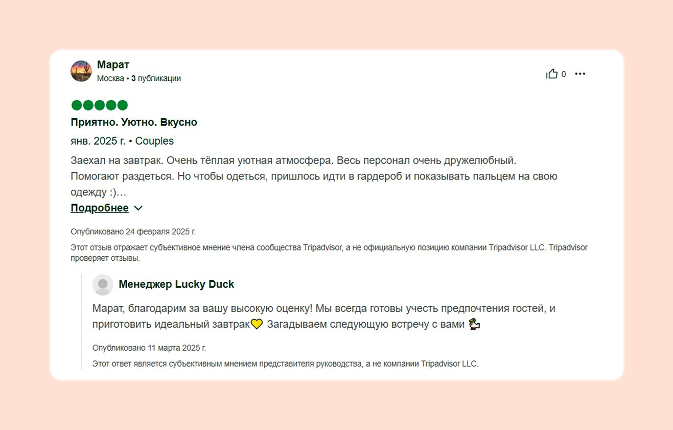2. Отвечайте на положительные отзывы. Даже если они неинформативные: «спасибо, всё понравилось». Обращайтесь к клиенту по имени, если это возможно, и старайтесь персонализировать ответ.