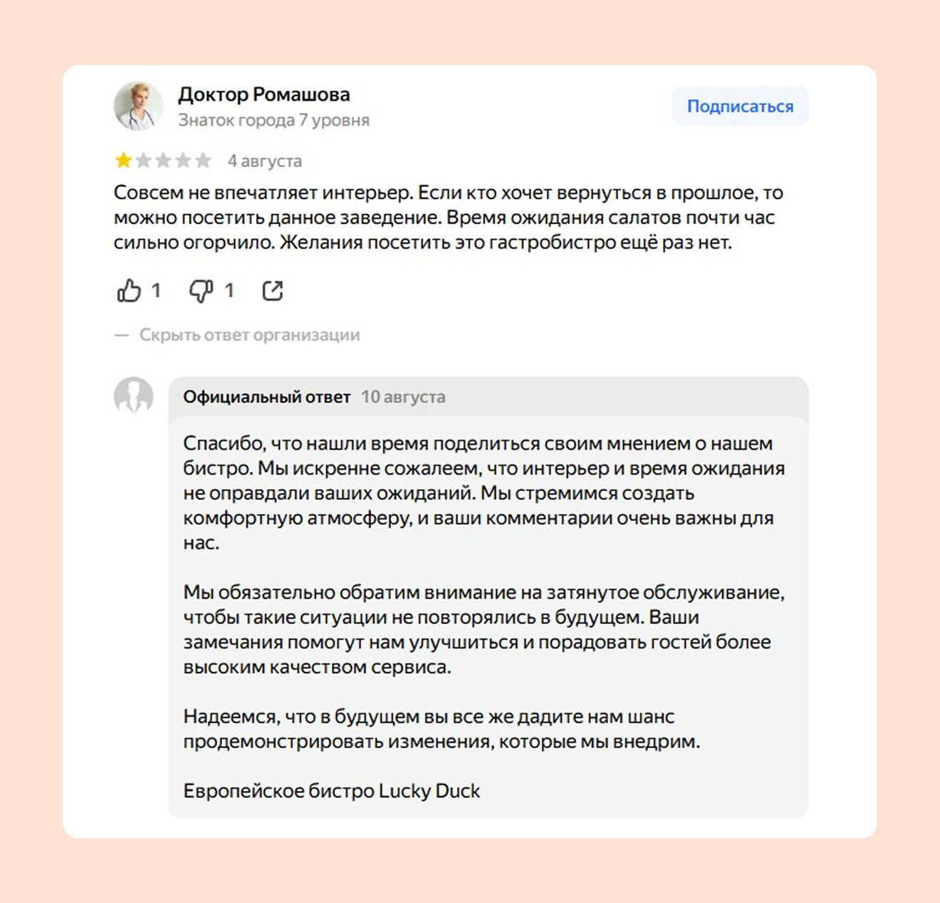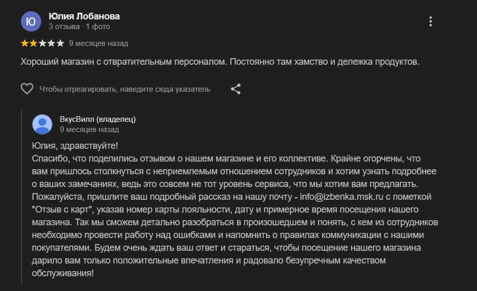 Даже если автор отзыва не ответит, такой реакции достаточно, чтобы поддержать репутацию и показать клиентоориентированность компании.