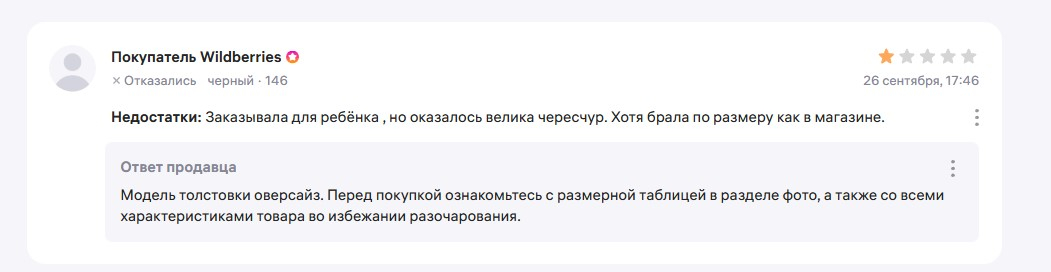 Бывает так, что отзыв реальный, но клиент не прав. Например, покупатель пропустил уведомление о доставке и жалуется, что долго ждёт заказ. Отвечайте на такие несправедливые отзывы спокойно и конструктивно: поблагодарите за обратную связь, вежливо объясните ситуацию и добавьте факты.