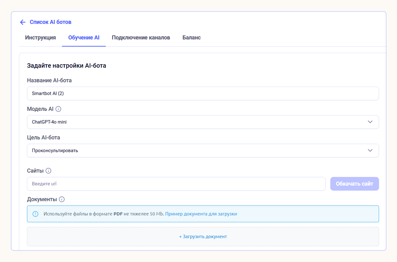 Инструкция, как настроить ИИ-ассистента в Smartbot Pro: