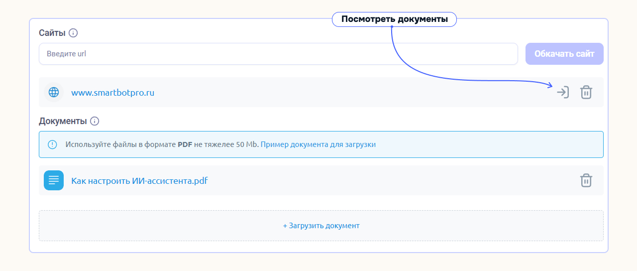 Совет: рекомендуем сначала обучить ИИ-ассистента по PDF-документам, потому что он лучше распознаёт файлы, чем вёрстку сайта. Также вы можете включить отображение источников, чтобы видеть, какие разделы базы знаний использует чат-бот. Это позволит сделать ответы модели точнее.