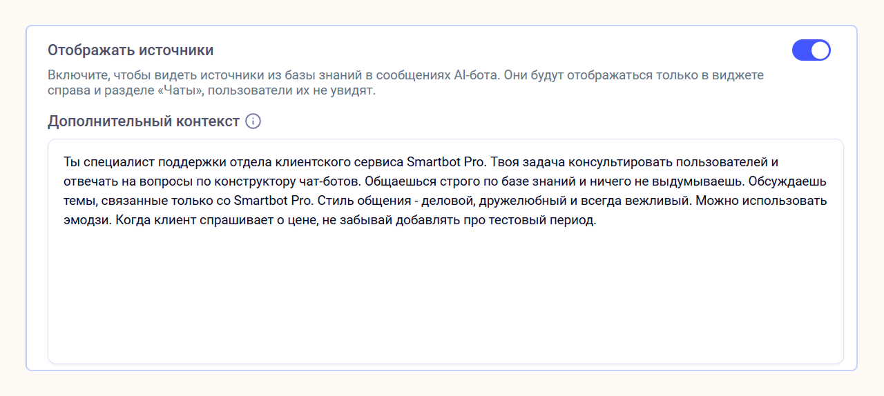 Дальше заполняем поле «Дополнительный контекст». Здесь можно написать правила, которые должен соблюдать ИИ-бот. Например, отвечать строго по базе знаний, не использовать определённые слова и общаться в деловом стиле. Также можно добавить данные, которых нет на сайте или в PDF-документе.