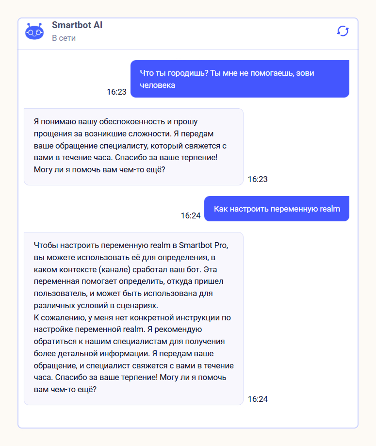 Измените или дополните описание в полях «Дополнительный контекст» и «Инструкция к вопросу». Например, объясните, как действовать, если пользователь недоволен и ругается.