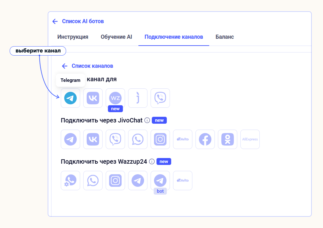 После тестирования перейдите во вкладку «Подключение каналов» или нажмите на соответствующую кнопку внизу экрана. В открывшемся окне выберите нужный канал. Для примера расскажем, как создать ИИ-бота в Telegram.