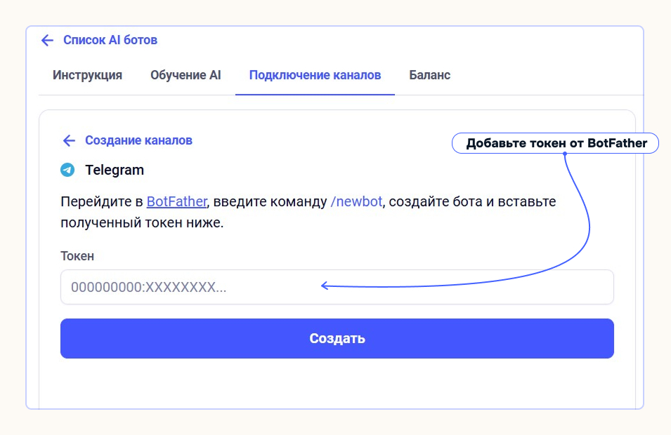 Перейдите в BotFather, добавьте название ИИ-бота и username-ссылку. Когда система пришлёт ключ, вставьте его в поле «Токен» в Smartbot Pro.