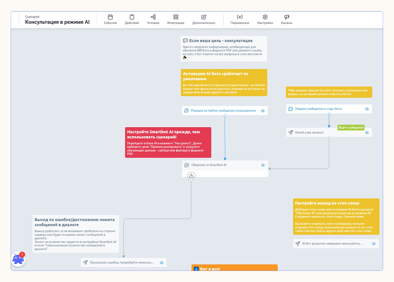 Настраивать блоки «Приветственное сообщение» и «Общение со Smartbot AI» не обязательно. Чат-бот будет работать и без стоп-слова, и лимита сообщений. Все обязательные настройки уже есть в шаблоне.