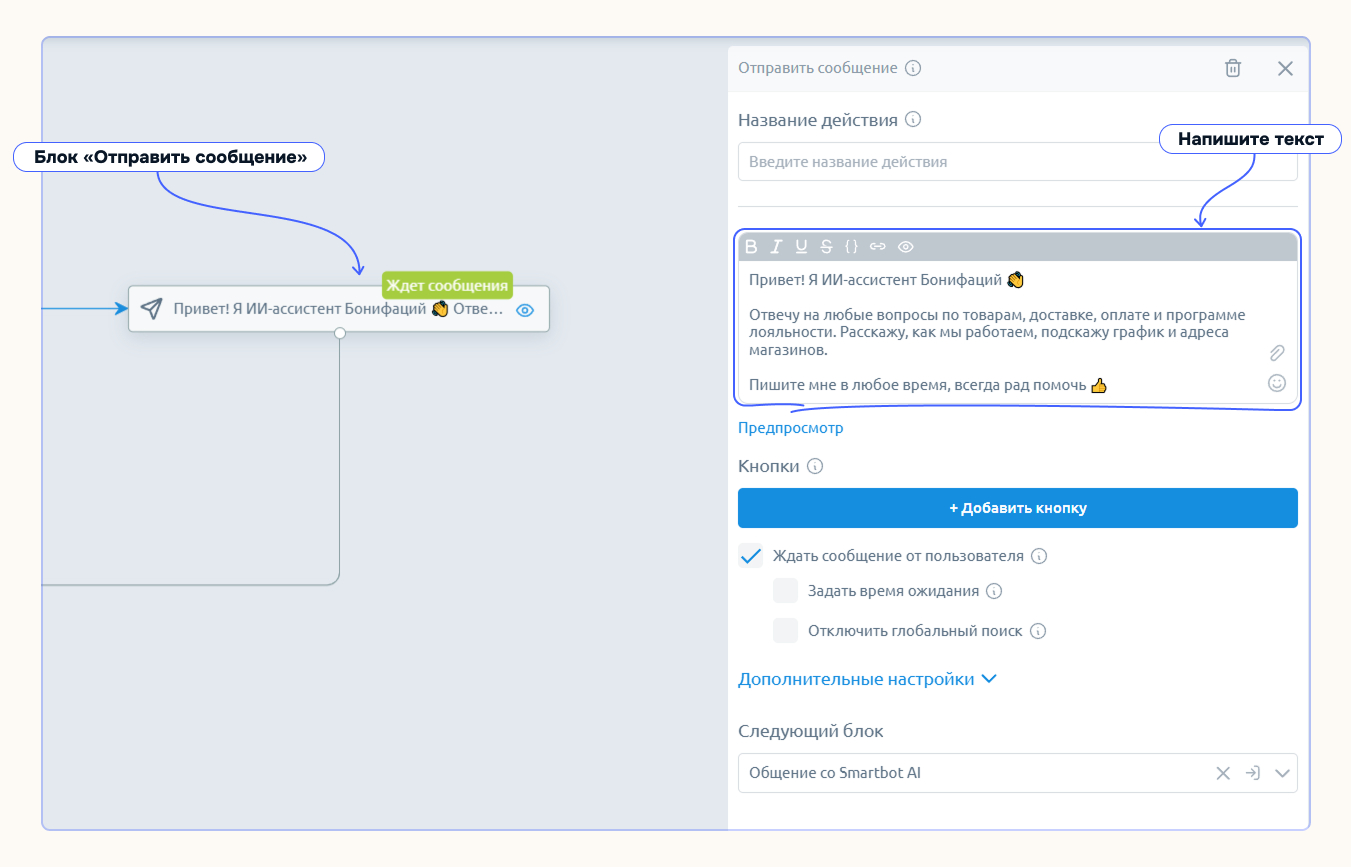 Напишите текст приветственного сообщения. Его получит пользователь, когда запустит бота. Кликните на соответствующий блок в сценарии и заполните поле с текстом в боковом меню.