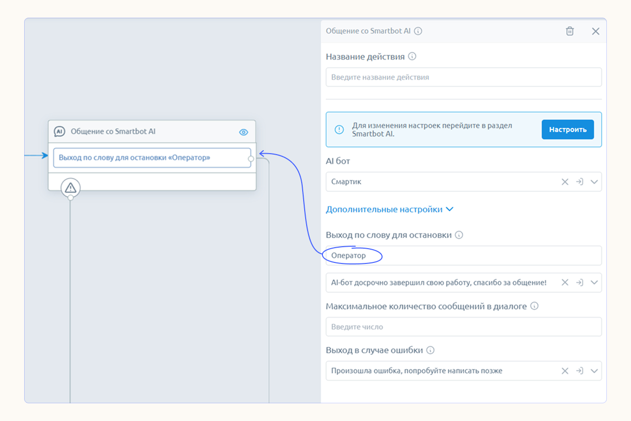 Настройте блок «Общение со Smartbot AI». Здесь вы можете указать стоп-слово: если пользователь отправит его, ИИ-бот прекратит общение. Протяните стрелку к блоку с названием «AI-бот досрочно завершил свою работу» или выберите его в боковом меню.