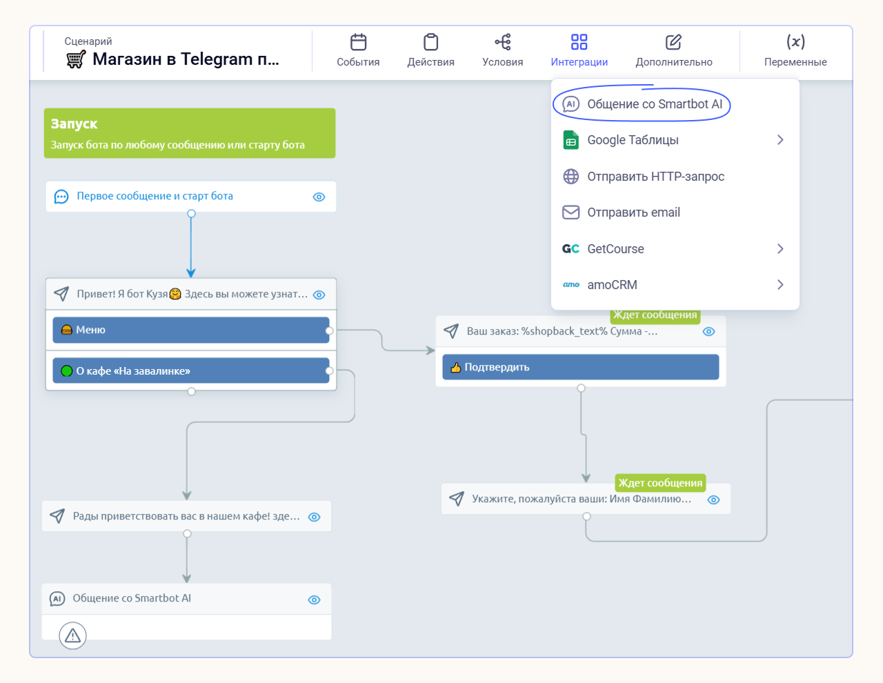 Блок «Общение со Smartbot AI» можно включить в любой сценарий. Например, добавить ИИ-ассистента в Telegram-магазин, чтобы он отвечал на вопросы и консультировал клиентов по товарам.