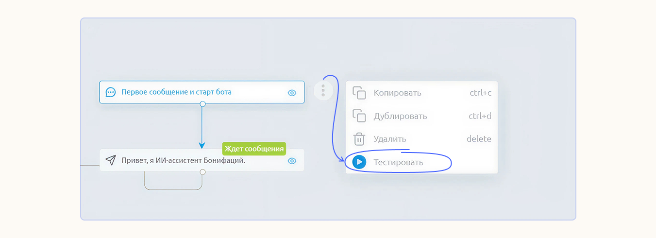 Проверьте, как работает цепочка шагов. Наведите курсор на блок в сценарии, кликните на иконку с тремя точками и выберите команду «Тестировать».