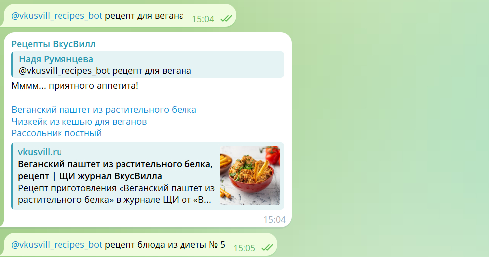 ВкусВилл: чат-бот с ИИ для подбора рецептов. Модель обучили на данных с сайта компании. Telegram-бот знает 1500 рецептов, которые разделены на 30 категорий по 4 критериям: популярности, тематике, основному ингредиенту и типу блюда. По запросу пользователя ИИ-ассистент предлагает три варианта.
