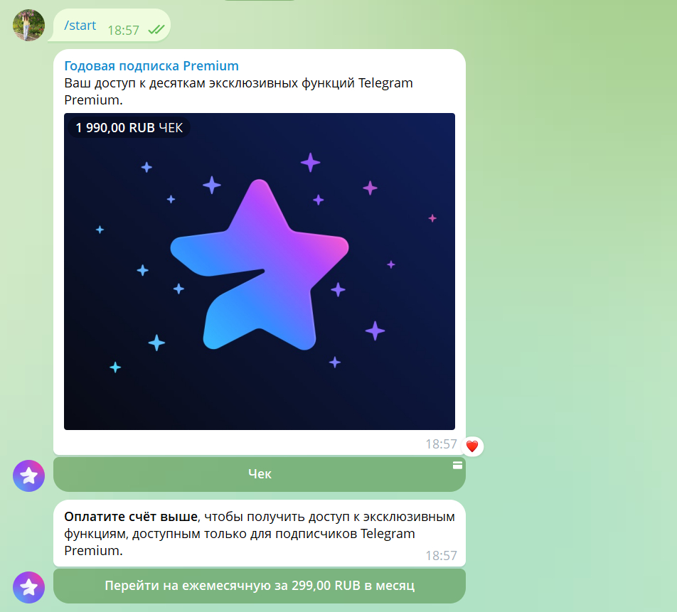 Кроме того, через чат-боты продают подписки, цифровые товары, курсы и услуги. Например, Premium-аккаунт в Telegram можно оплатить за 1 минуту.