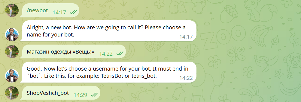 2. Придумайте и напишите имя бота, его увидят пользователи. После введите @username — это уникальный ник, по которому чат-бот можно найти в Telegram. Он должен заканчиваться на bot.