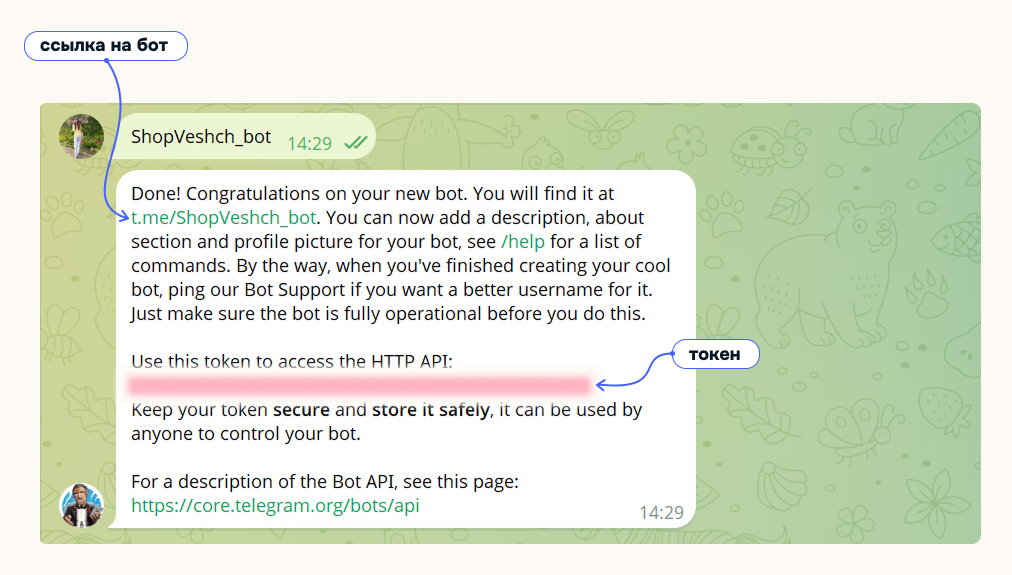 3. BotFather отправит токен — это ключ, чтобы подключить бота к сторонним сервисам. Например, к сценарию, который вы создали на конструкторе. Также в сообщении будет ссылка на бота.